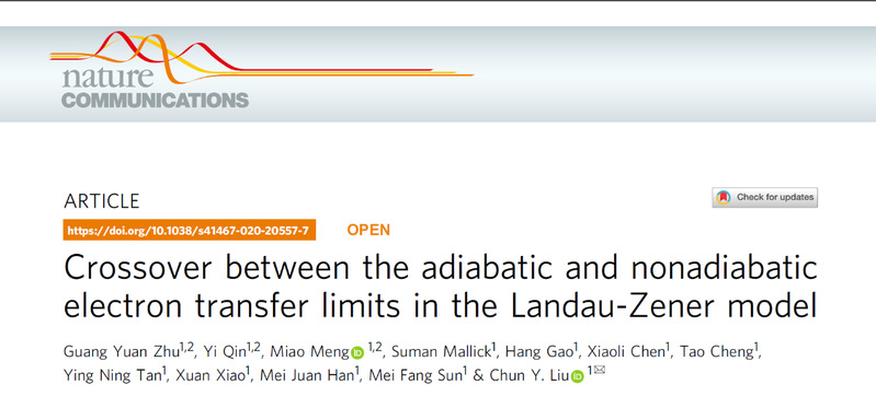 1月19日,bwin必赢唯一官方刘春元教授课题组在Nature子刊Nature Communications(IF:12.121)上发表了题为“Crossover between the adiabatic and nonadiabatic electron transfer limits in the Landau-Zener model”的原创性研究论文,我校为第一完成单位,刘春元教授为唯一通讯作者。